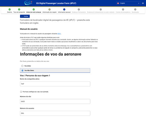 Você irá colocar a companhia aérea, o número do voo, número do assento, que muitas vezes você só fica sabendo após fazer o check-in online da sua viagem, colocará o País / Local de Embarque, Data/hora de partida, o aeroporto de embarque, o Destino / País de Trânsito, caso você faça uma parada, por exemplo: Brasil - Portugal - Itália. Nesse caso, você colocará primeiro os dados do voo do Brasil para Portugal e o seu Aeroporto de destino / trânsito, assim como a Data/hora de chegada neste país.